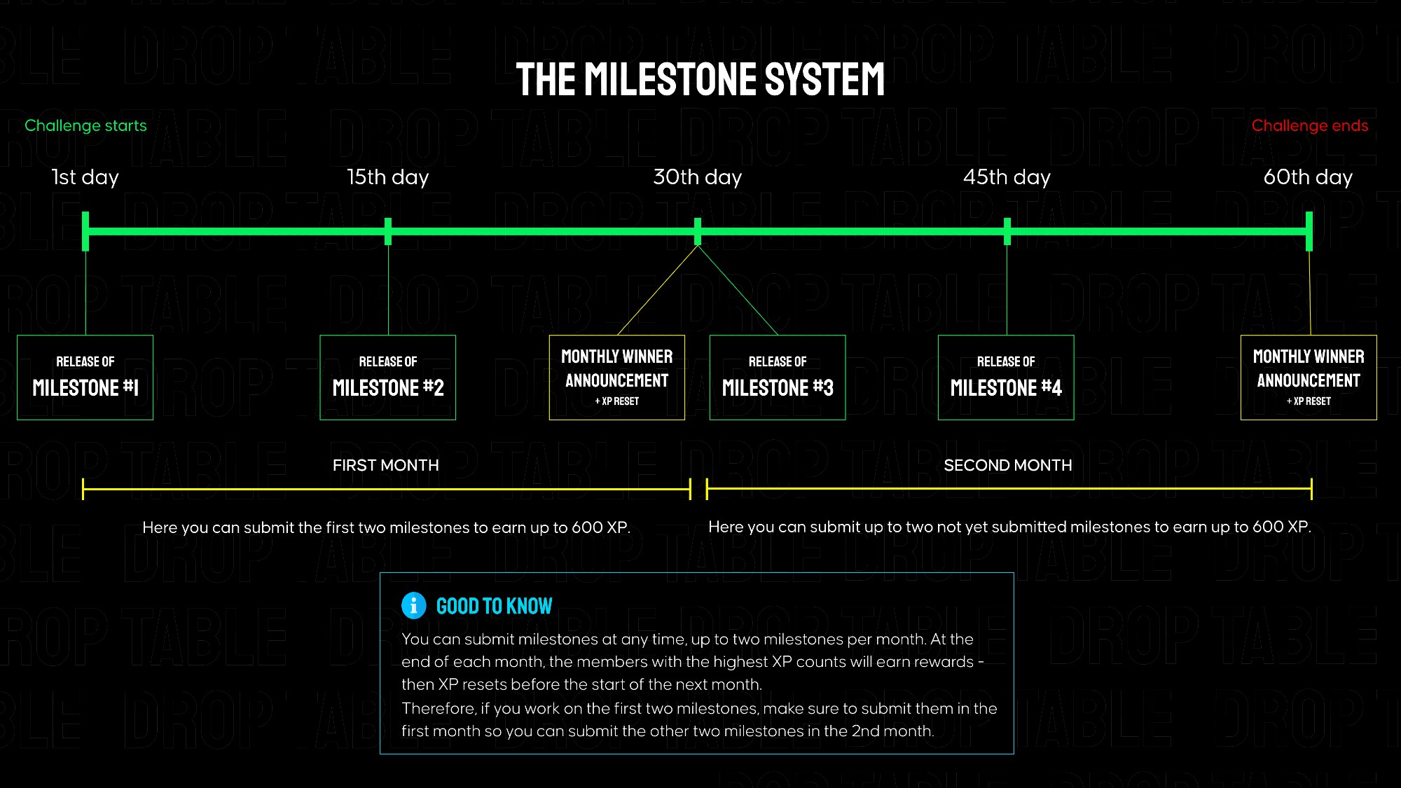 ScribbleDash is separated into 4 milestones that build on each other, each granting 300 XP when submitted on Discord. Every ~2 weeks a new milestone is released here in the members area. The total challenge goes over 2 months.